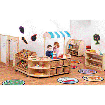 Complete role play zone. Includes 1 x white board panel, double door panel, mobile tall unit with shop canopy, mobile trolley with mirror back, tall corner unit, tilt tote storage and 2 x panel connector