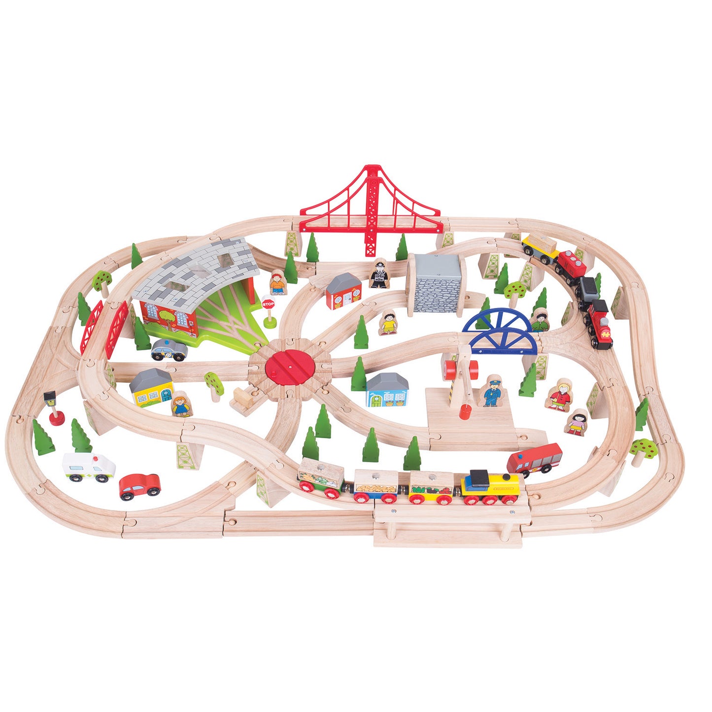 Encourages imaginative play, This 130 piece train set has so much included it will keep children busy for hours. Low rail tracks, high rail tracks up above the forest, bridges, a tunnel and a triple engine shed.