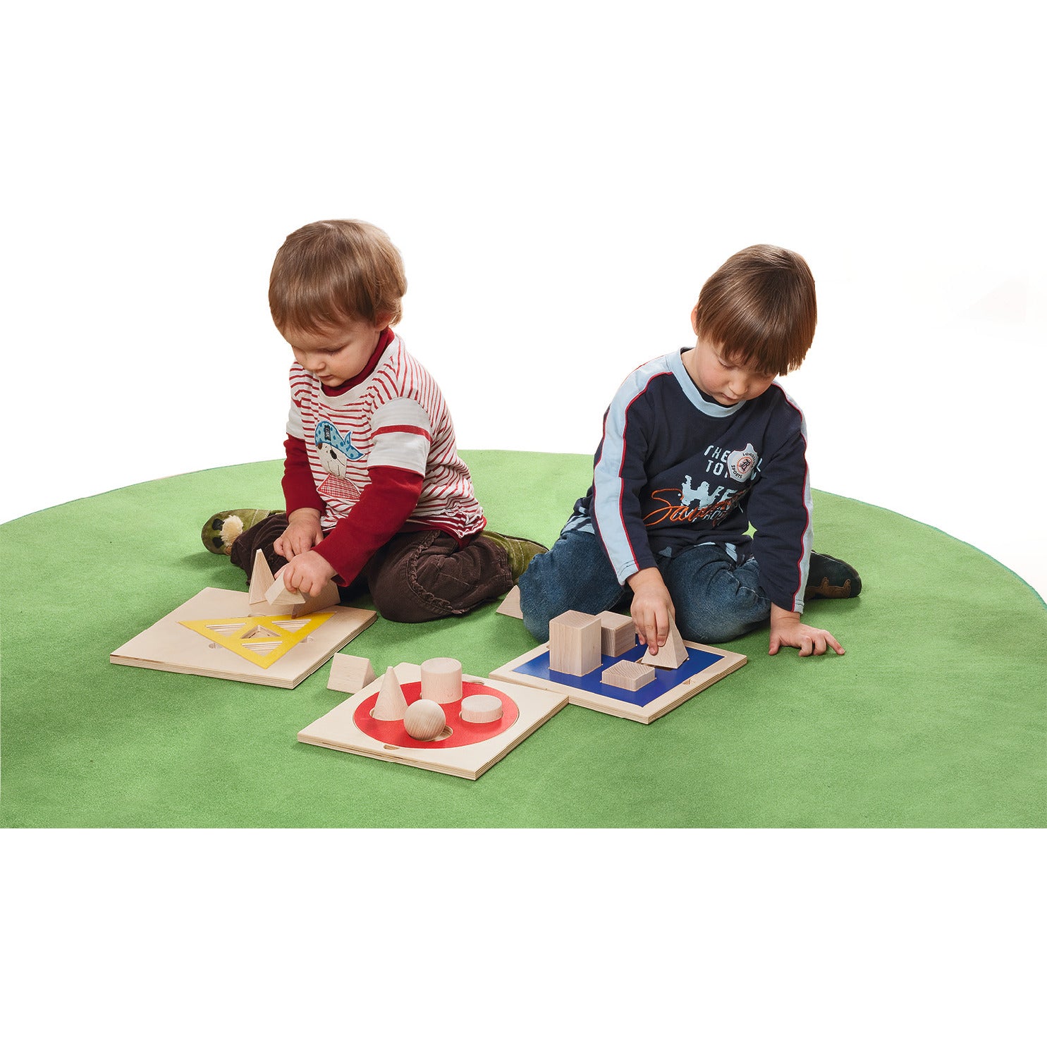 Also includes a cotton storage bag and teacher's notes, Match the solid beech shapes to the base board with the appropriate outline shape, e.g. the sphere, disk, cylinder and cone will all fit into the board with the circular cut-outs. Includes 12 solid beech shapes, 3 insert panels and base boards 240 x 240 x 13mm, cotton storage bag and teacher's notes. Suitable for ages 3+.