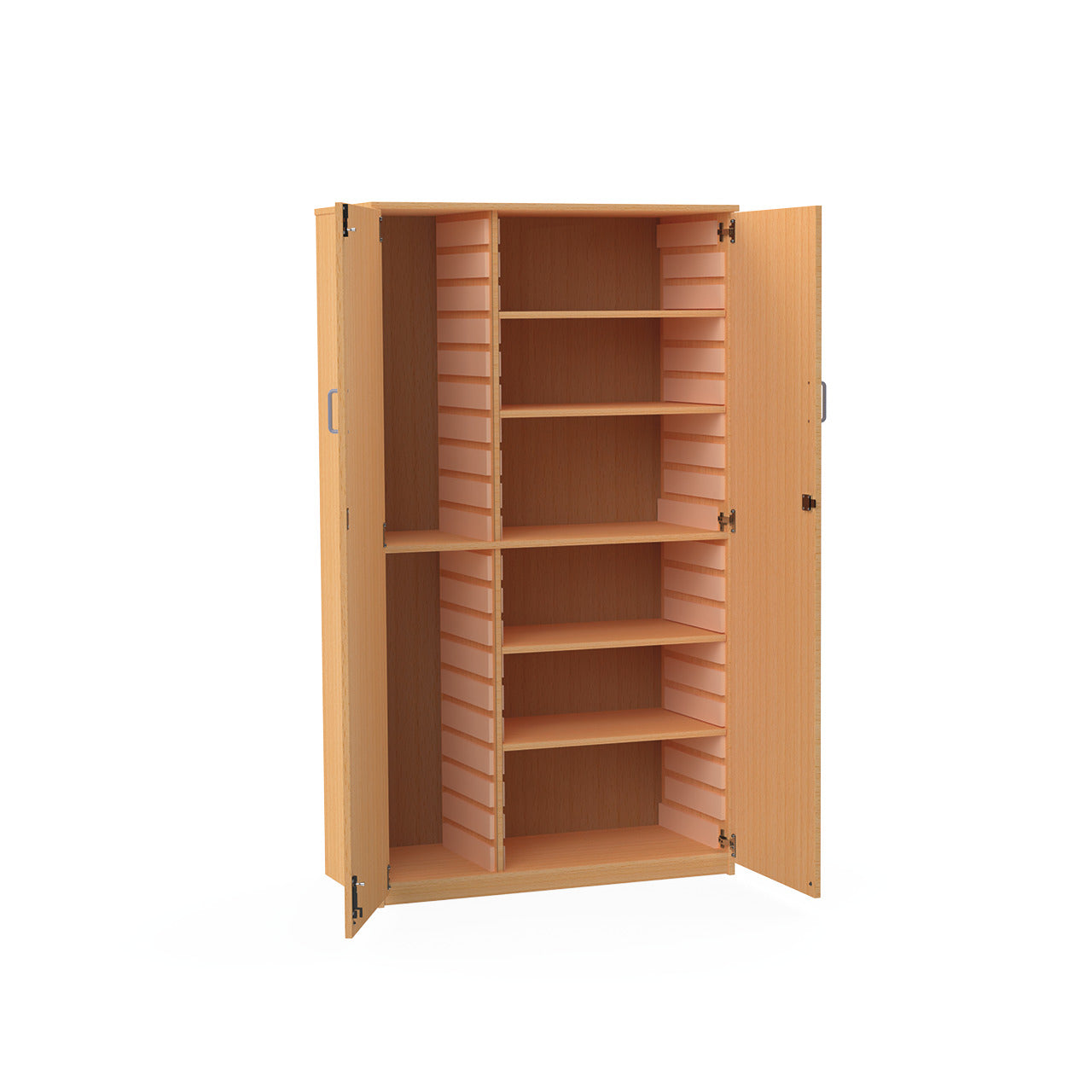 Left hand section of the cupboard can accommodate 20 or 16 Gratnell shallow trays (supplied separately), with 1 fixed and 4 adjustable shelves in the right hand section.