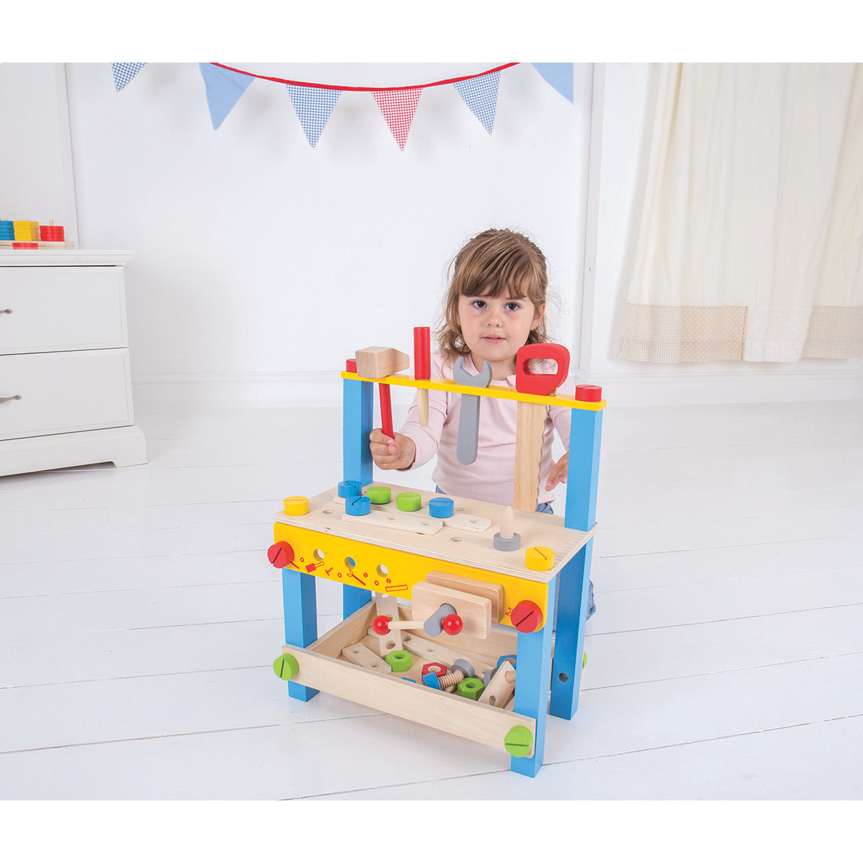 Suitable for age 3+ years, Features kids toy work bench with 26 play pieces. Includes a clamp, wrench, nuts and bolts, screwdriver and more. 260 x 495 x 365mm (l x h x w). Suitable for age 3+ years., Please allow 2 weeks for direct delivery