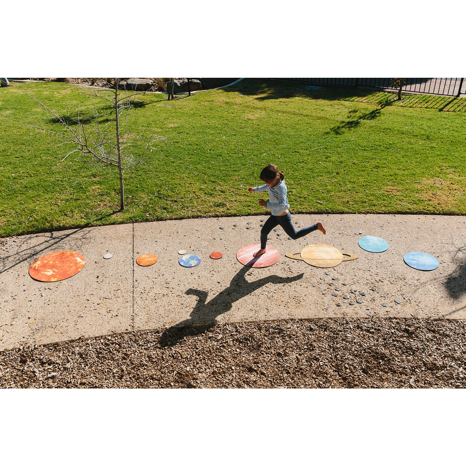 Suitable for children aged 3+, Set out the planets on these thick rubber-backed non-slip mats and have the children jump from one to the next as they explore and discuss space. This 10 piece set includes 8 planets, the Moon and the Sun, each labelled, so you can recreate the solar system. Measures approx. 810 x 470mm for the largest and 90mm dia. for the smallest. Great for teaching science and space through outdoor play and enhances gross motor skills. Made with natural rubber and micro suede., Please allow 1 week for direct delivery