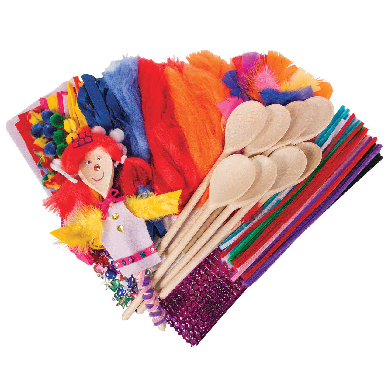 An excellent craft activity, Pack of wooden spoons and craft materials to make 10 puppet people. Includes: 10 Wooden Spoons, Wiggly Eyes, Pipe Cleaners, Pom-Poms, Sequin Mesh, Foam, Gems, Sequins, Spangles - plenty to allow them to use their imaginations to create their own little characters.