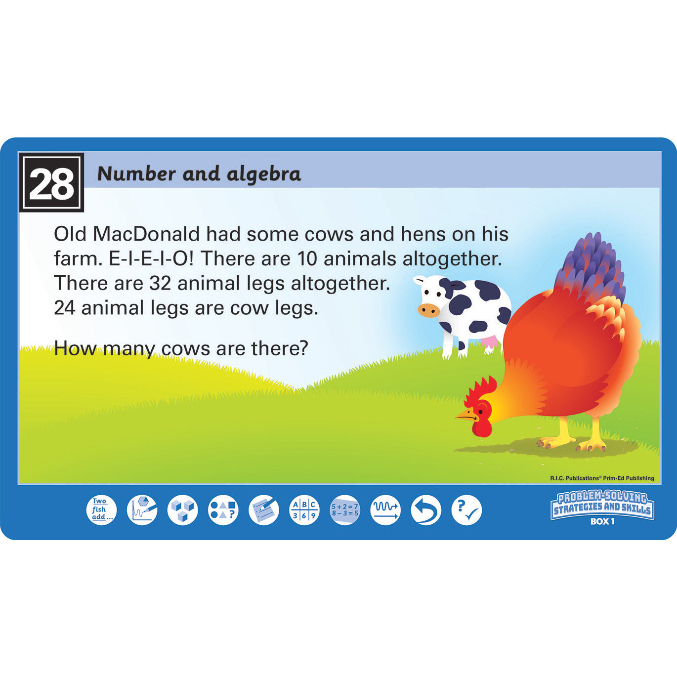 There are three boxes for each year group, comprising: 30 Number and Algebra cards, plus answers, 30 Measurement and Geometry cards, plus answers, 30 Statistics and Chance cards, plus answers, The Problem-Solving Strategies and skills maths cards provide a wide variety of motivating and high-interest problem solving activities.