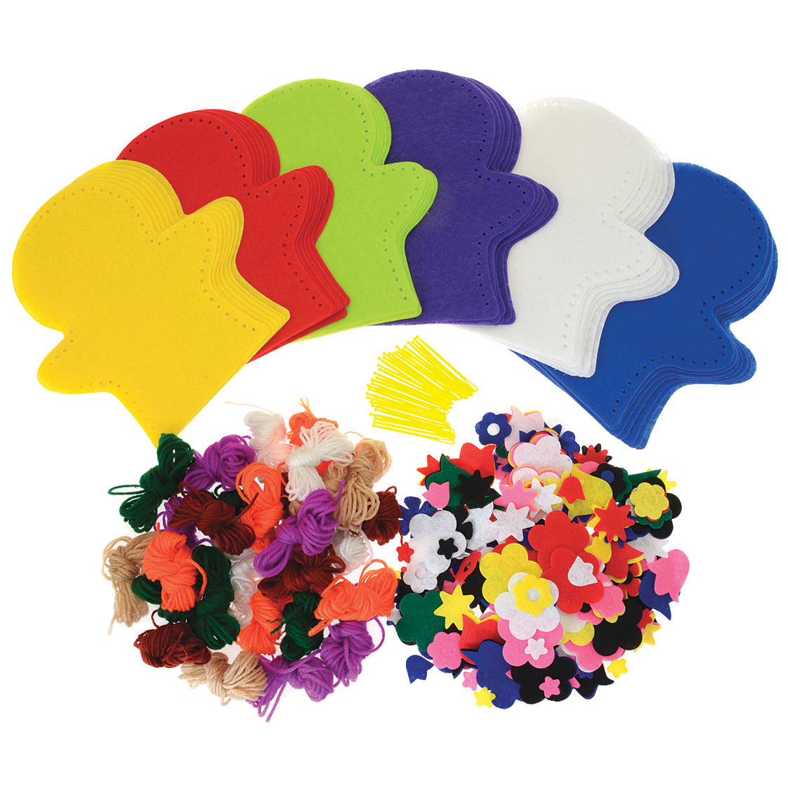 Includes instructions, Set includes 60 pre-cut and punches puppet shapes in a fleecy fabric (6 assorted colours).