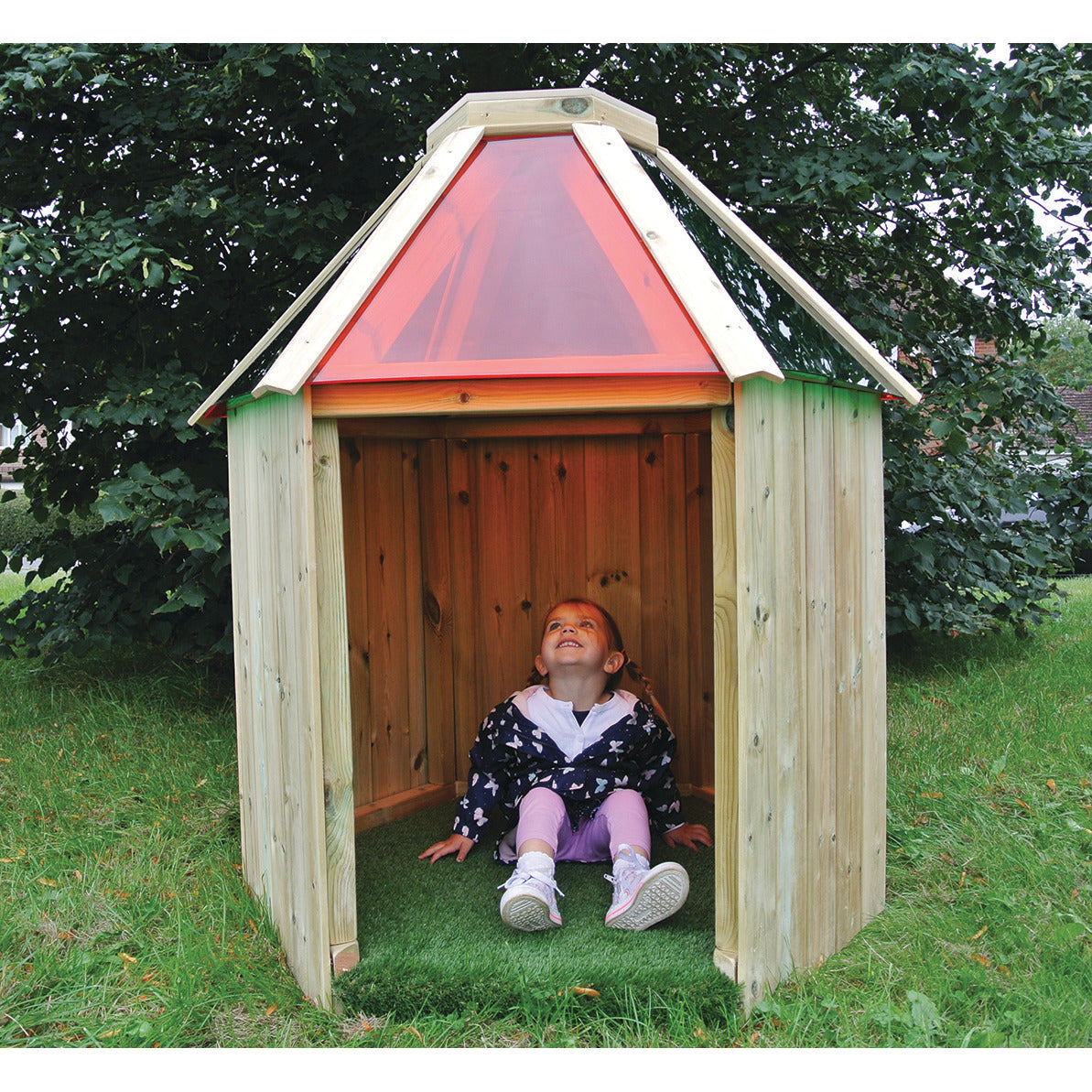 Fully assembled, This beautiful wooden rainbow sky den features an artificial grass base for children to lay or sit on and gaze up through the coloured Perspex roof. Children will love staring up at the calming colours and reflections as the light shines through. The perfect size to fit in any playground, garden, or sensory area. Due to the construction, this product is not 100% water-tight.