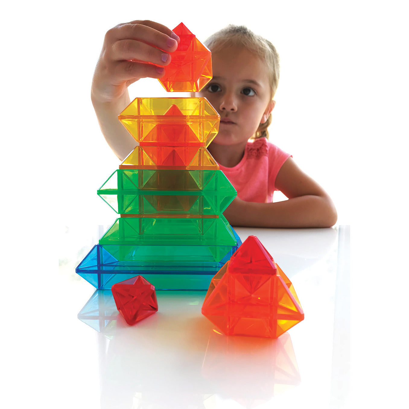 Over 100 colourful patterns and shapes can be created, An amazing geometry resource which will light up a child’s creativity! 15 translucent coloured pieces magically blend together when stacked, nested or interlocked. Great for use on a light table. Discover an endless variety of colourful shapes and patterns. Complete with ideas booklet which shows over 100 colourful patterns and shapes. Size of largest piece 100 x 100 x 35mm. Storage box included. Suitable for ages 3+.