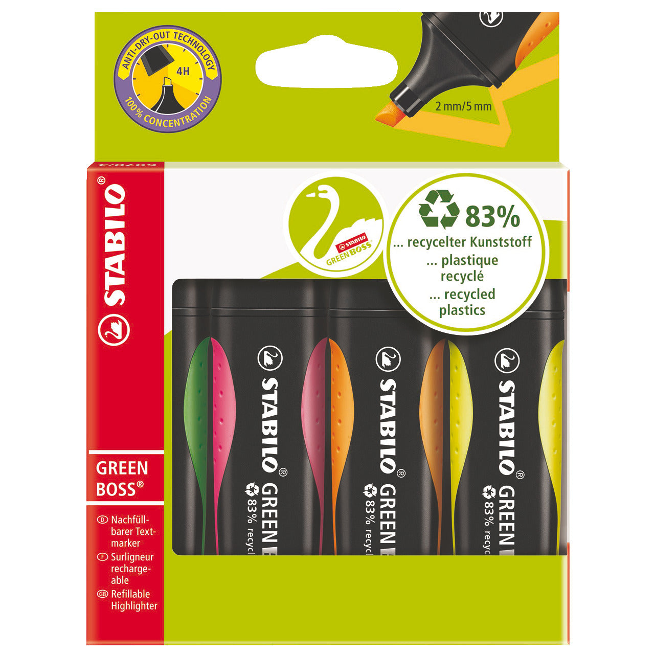 83% recycled plastic to help conserve natural resources and reduce landfill, This Stabilo Highlighter combines all the high quality features of the BOSS Original range with sustainability, and is the perfect choice for environmentally conscious consumers.