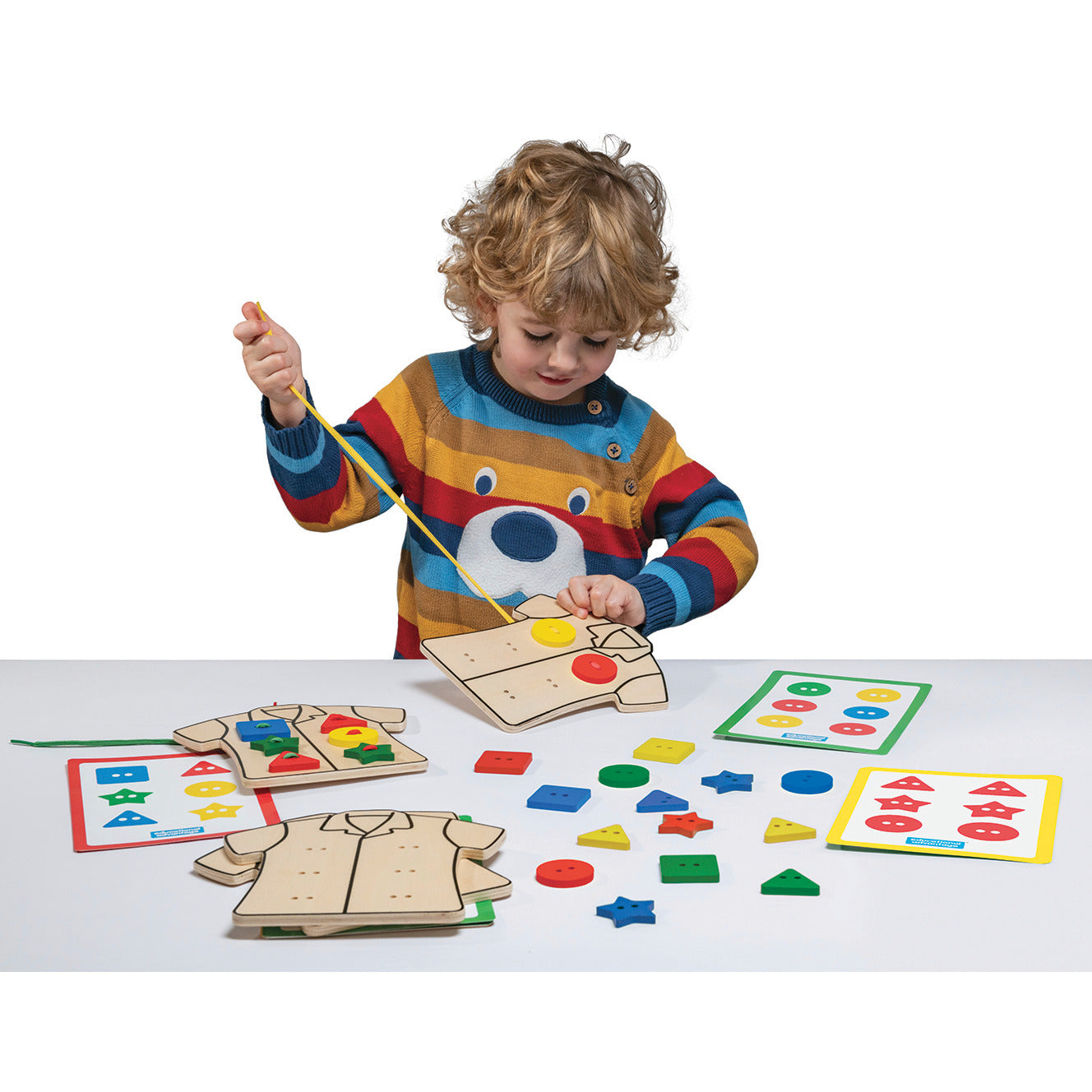 Great for developing fine motor skills, Clothes shapes carved from wood with holes for lacing activities